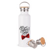 Happy father's Days, Μεταλλικό παγούρι θερμός (Stainless steel) Λευκό με ξύλινο καπάκι (bamboo), διπλού τοιχώματος, 750ml