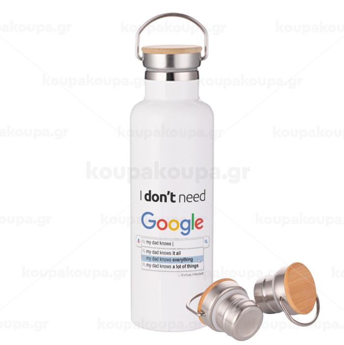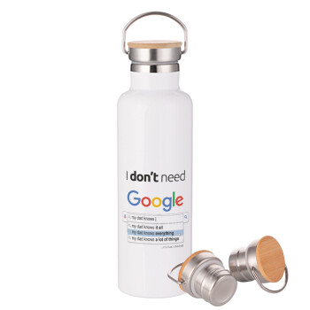I don't need Google my dad..., Μεταλλικό παγούρι θερμός (Stainless steel) Λευκό με ξύλινο καπάκι (bamboo), διπλού τοιχώματος, 750ml
