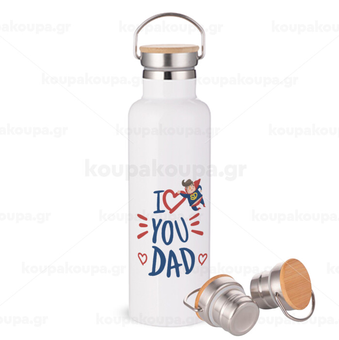 Super Dad, Μεταλλικό παγούρι θερμός (Stainless steel) Λευκό με ξύλινο καπάκι (bamboo), διπλού τοιχώματος, 750ml