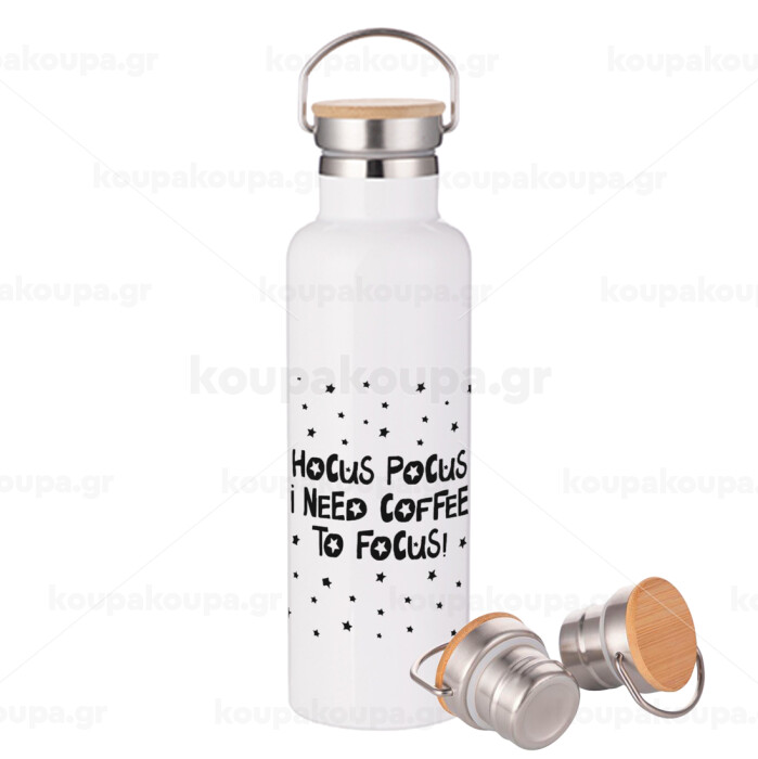 Hocus pocus i need coffee to focus - halloween, Μεταλλικό παγούρι θερμός (Stainless steel) Λευκό με ξύλινο καπάκι (bamboo), διπλού τοιχώματος, 750ml
