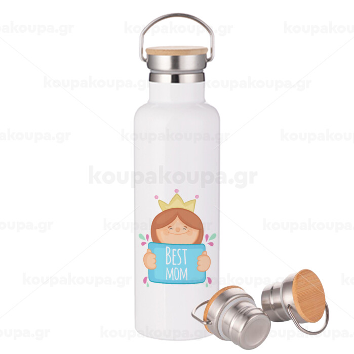 Best mom Princess, Μεταλλικό παγούρι θερμός (Stainless steel) Λευκό με ξύλινο καπάκι (bamboo), διπλού τοιχώματος, 750ml