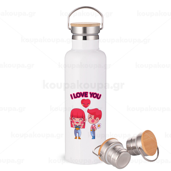 Couple, I love you, Μεταλλικό παγούρι θερμός (Stainless steel) Λευκό με ξύλινο καπάκι (bamboo), διπλού τοιχώματος, 750ml