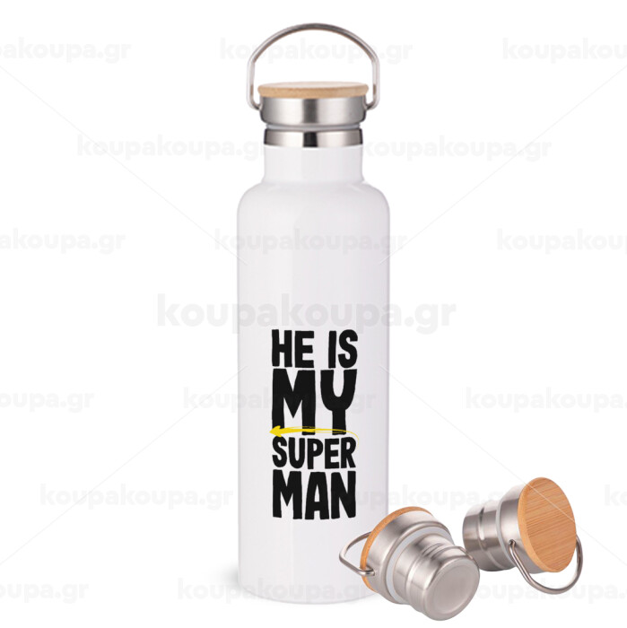 He is my superman, Μεταλλικό παγούρι θερμός (Stainless steel) Λευκό με ξύλινο καπάκι (bamboo), διπλού τοιχώματος, 750ml