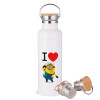 I love by minion, Μεταλλικό παγούρι θερμός (Stainless steel) Λευκό με ξύλινο καπάκι (bamboo), διπλού τοιχώματος, 750ml