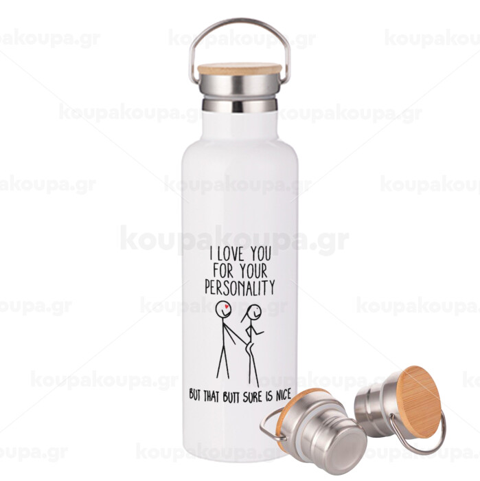 I Love you for your personality, Μεταλλικό παγούρι θερμός (Stainless steel) Λευκό με ξύλινο καπάκι (bamboo), διπλού τοιχώματος, 750ml