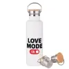 LOVE MODE ON, Μεταλλικό παγούρι θερμός (Stainless steel) Λευκό με ξύλινο καπάκι (bamboo), διπλού τοιχώματος, 750ml