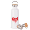 Love, Μεταλλικό παγούρι θερμός (Stainless steel) Λευκό με ξύλινο καπάκι (bamboo), διπλού τοιχώματος, 750ml