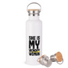 She is my wonder woman, Μεταλλικό παγούρι θερμός (Stainless steel) Λευκό με ξύλινο καπάκι (bamboo), διπλού τοιχώματος, 750ml