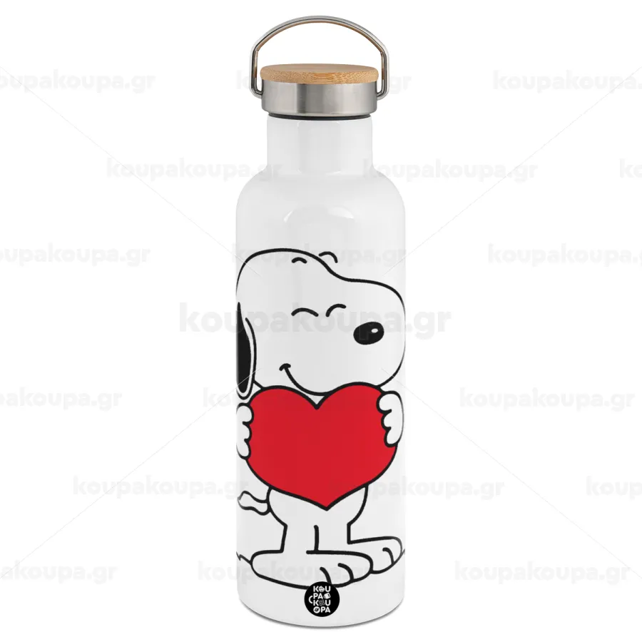 Snoopy takemy heart, Μεταλλικό παγούρι θερμός (Stainless steel) Λευκό με ξύλινο καπάκι (bamboo), διπλού τοιχώματος, 750ml