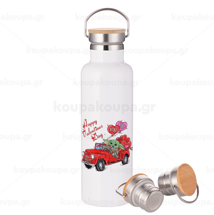 Yoda, happy valentines day (xoxo), Μεταλλικό παγούρι θερμός (Stainless steel) Λευκό με ξύλινο καπάκι (bamboo), διπλού τοιχώματος, 750ml