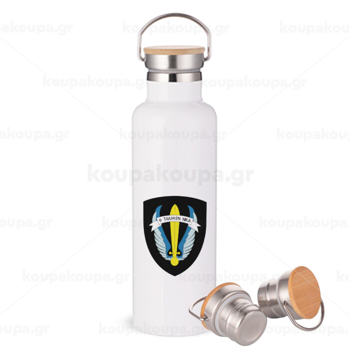 Έμβλημα Μονάδων Καταδρομών Ο Τολμων Νικα - Λοκ, Μεταλλικό παγούρι θερμός (Stainless steel) Λευκό με ξύλινο καπάκι (bamboo), διπλού τοιχώματος, 750ml