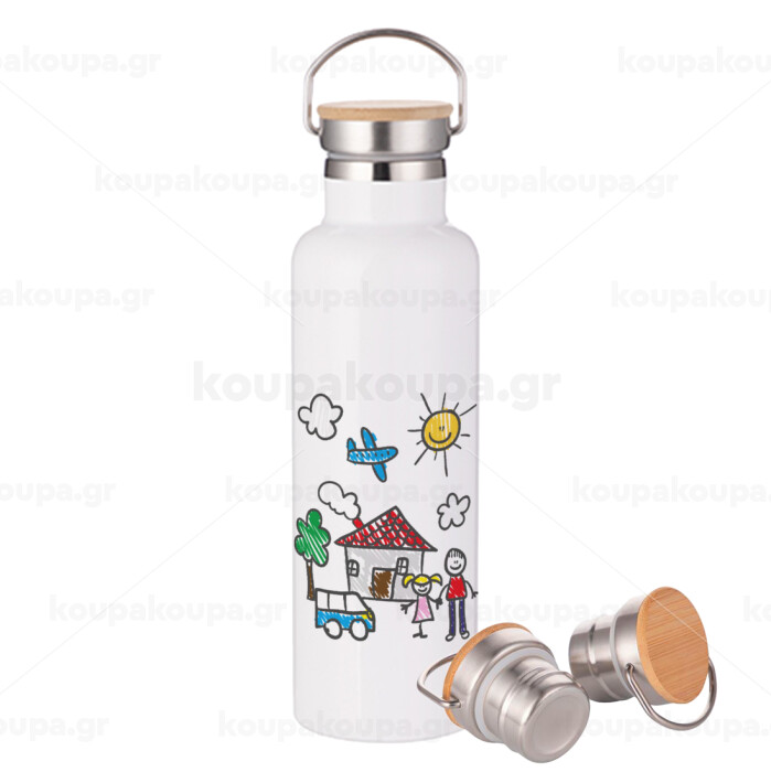 Παιδική ζωγραφιά, Μεταλλικό παγούρι θερμός (Stainless steel) Λευκό με ξύλινο καπάκι (bamboo), διπλού τοιχώματος, 750ml
