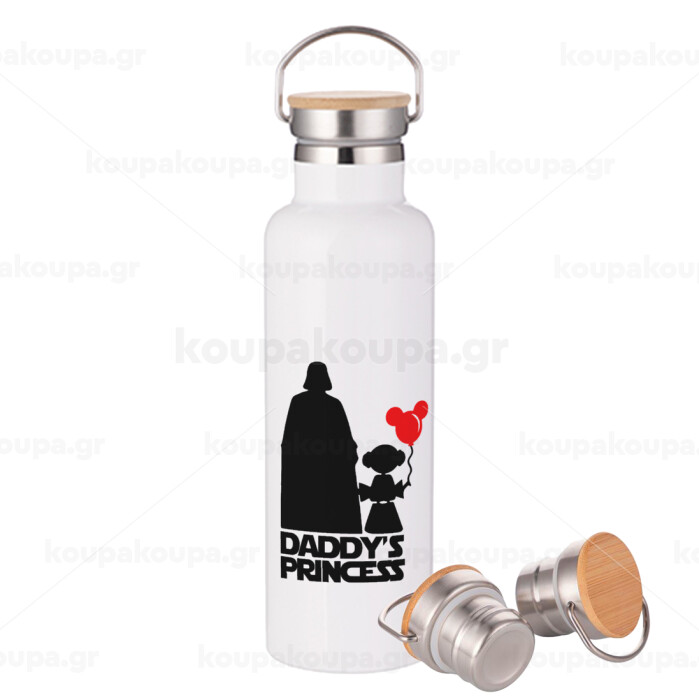 Daddy's princess, Μεταλλικό παγούρι θερμός (Stainless steel) Λευκό με ξύλινο καπάκι (bamboo), διπλού τοιχώματος, 750ml