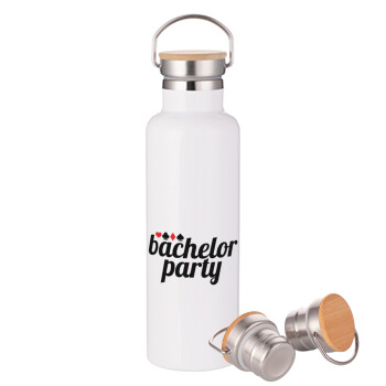 Bachelor party, Μεταλλικό παγούρι θερμός (Stainless steel) Λευκό με ξύλινο καπάκι (bamboo), διπλού τοιχώματος, 750ml