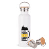 Don't worry BEER Happy, Μεταλλικό παγούρι θερμός (Stainless steel) Λευκό με ξύλινο καπάκι (bamboo), διπλού τοιχώματος, 750ml