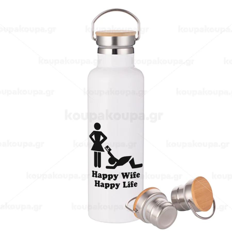 Happy Wife, Happy Life, Μεταλλικό παγούρι θερμός (Stainless steel) Λευκό με ξύλινο καπάκι (bamboo), διπλού τοιχώματος, 750ml