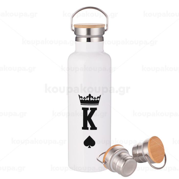 King, Μεταλλικό παγούρι θερμός (Stainless steel) Λευκό με ξύλινο καπάκι (bamboo), διπλού τοιχώματος, 750ml