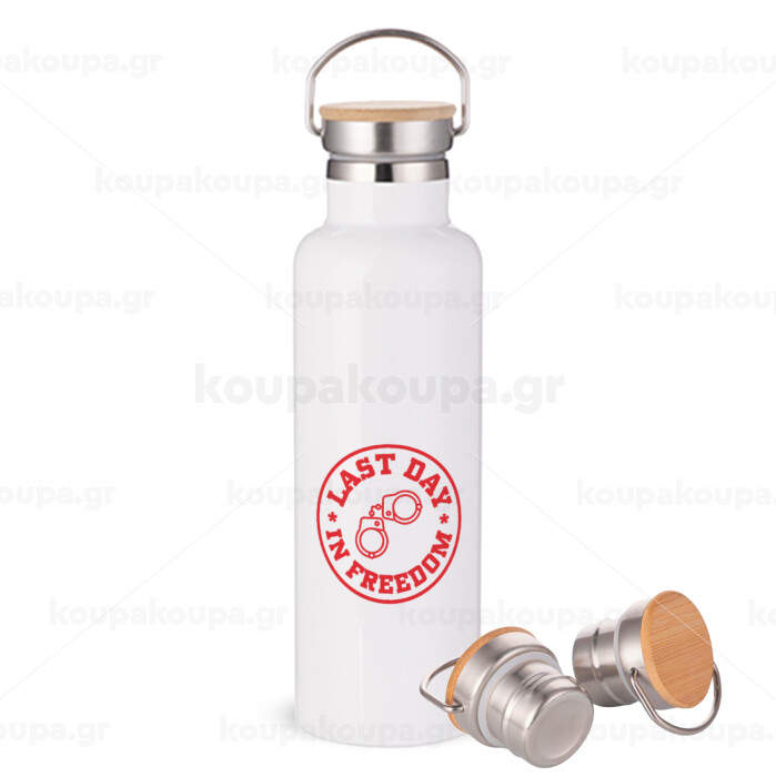 Last day freedom, Μεταλλικό παγούρι θερμός (Stainless steel) Λευκό με ξύλινο καπάκι (bamboo), διπλού τοιχώματος, 750ml