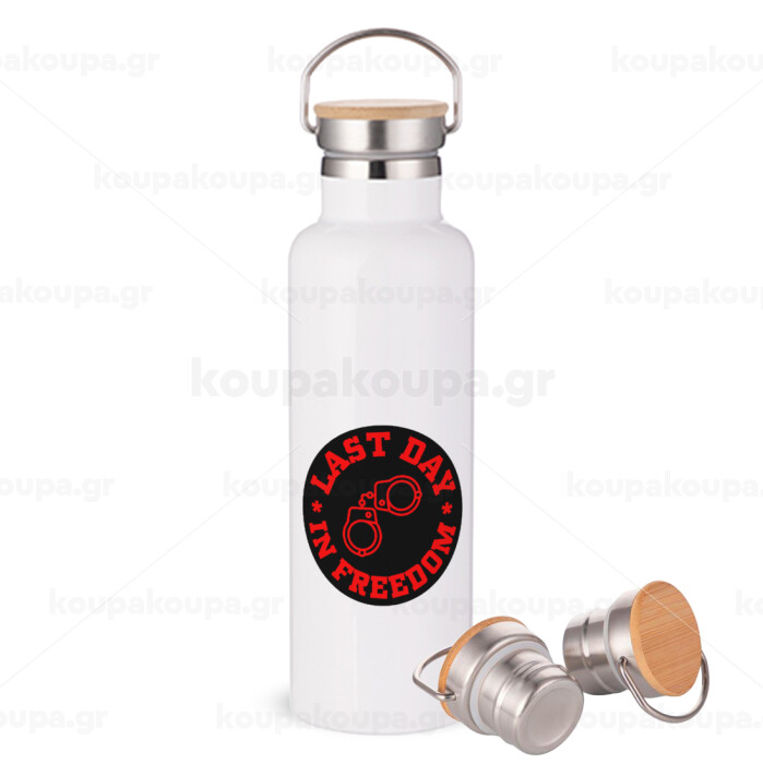 Last day in freedom, Μεταλλικό παγούρι θερμός (Stainless steel) Λευκό με ξύλινο καπάκι (bamboo), διπλού τοιχώματος, 750ml
