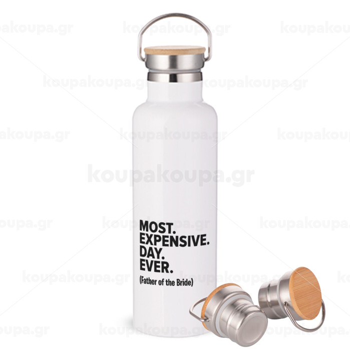 Most expensive day ever, Μεταλλικό παγούρι θερμός (Stainless steel) Λευκό με ξύλινο καπάκι (bamboo), διπλού τοιχώματος, 750ml