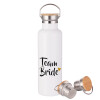 Team Bride, Μεταλλικό παγούρι θερμός (Stainless steel) Λευκό με ξύλινο καπάκι (bamboo), διπλού τοιχώματος, 750ml