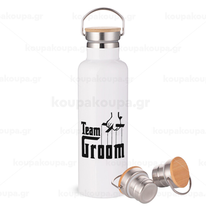 Team Groom, Μεταλλικό παγούρι θερμός (Stainless steel) Λευκό με ξύλινο καπάκι (bamboo), διπλού τοιχώματος, 750ml
