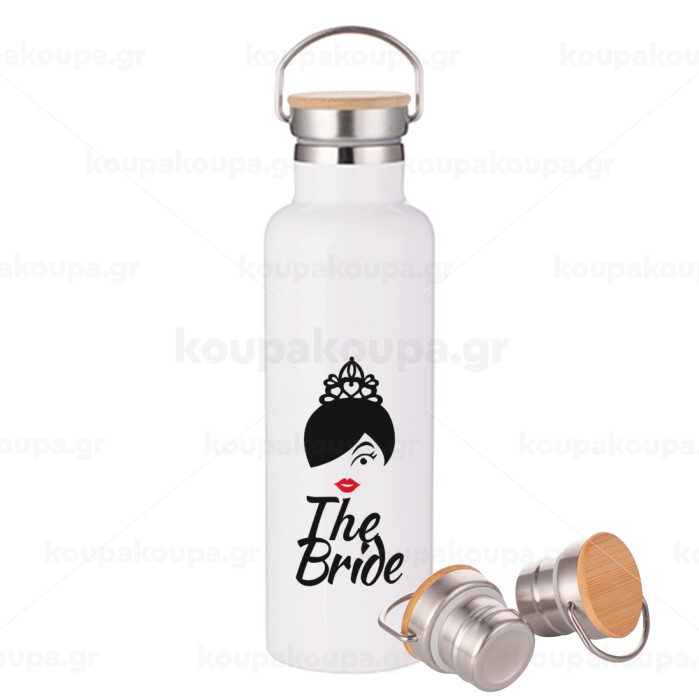The Bride red kiss, Μεταλλικό παγούρι θερμός (Stainless steel) Λευκό με ξύλινο καπάκι (bamboo), διπλού τοιχώματος, 750ml