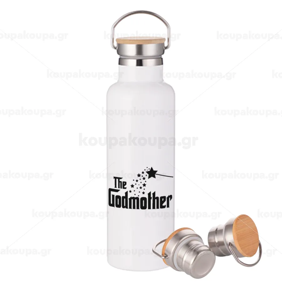 Fairy GodMother, Μεταλλικό παγούρι θερμός (Stainless steel) Λευκό με ξύλινο καπάκι (bamboo), διπλού τοιχώματος, 750ml