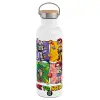 Back to the School Buzz & Friends, Μεταλλικό παγούρι θερμός (Stainless steel) Λευκό με ξύλινο καπάκι (bamboo), διπλού τοιχώματος, 750ml