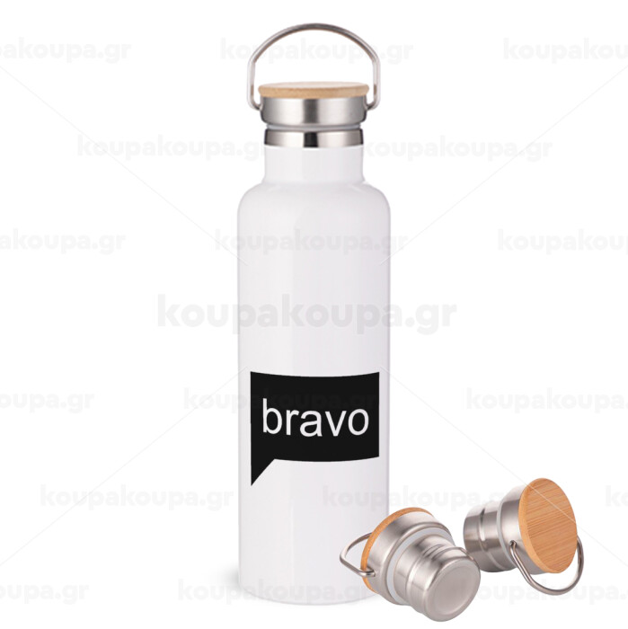Bravo, Μεταλλικό παγούρι θερμός (Stainless steel) Λευκό με ξύλινο καπάκι (bamboo), διπλού τοιχώματος, 750ml