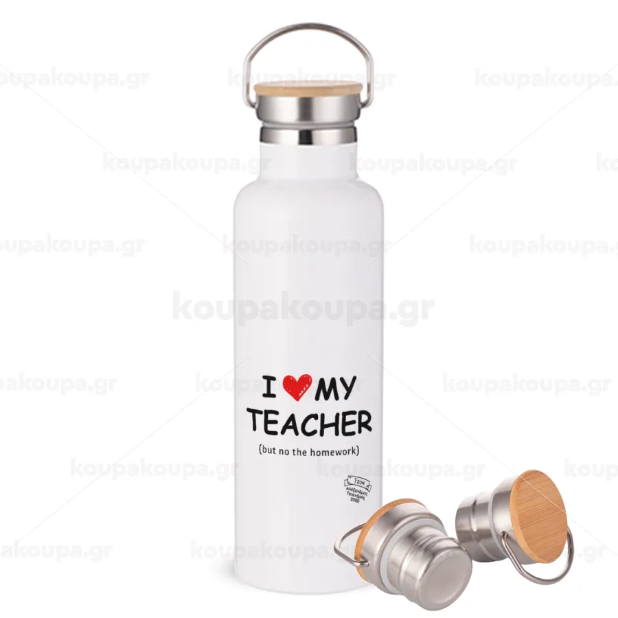 i love my teacher but no the homework, Μεταλλικό παγούρι θερμός (Stainless steel) Λευκό με ξύλινο καπάκι (bamboo), διπλού τοιχώματος, 750ml