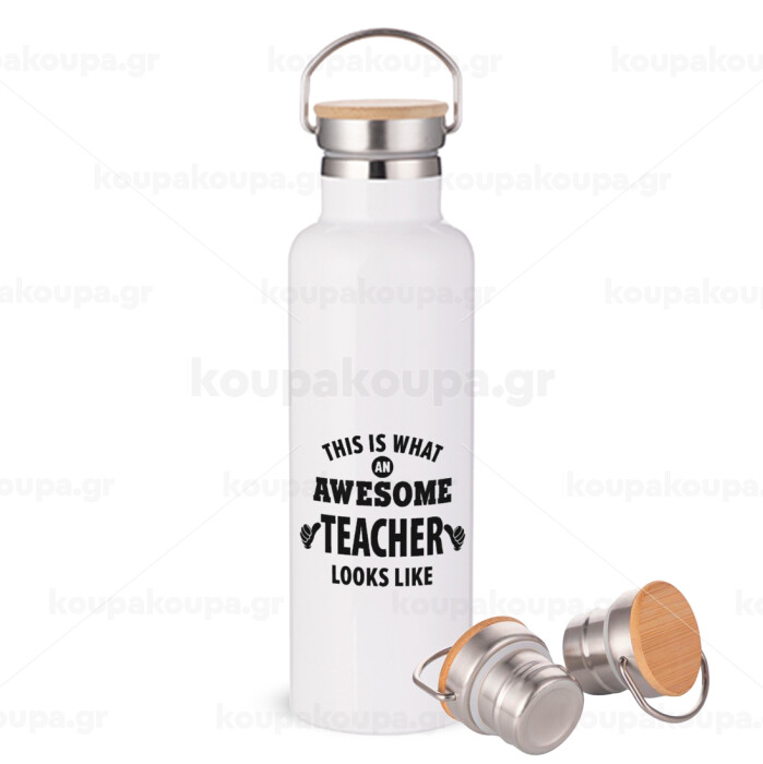 This is what an awesome teacher looks like hands!!! , Μεταλλικό παγούρι θερμός (Stainless steel) Λευκό με ξύλινο καπάκι (bamboo), διπλού τοιχώματος, 750ml