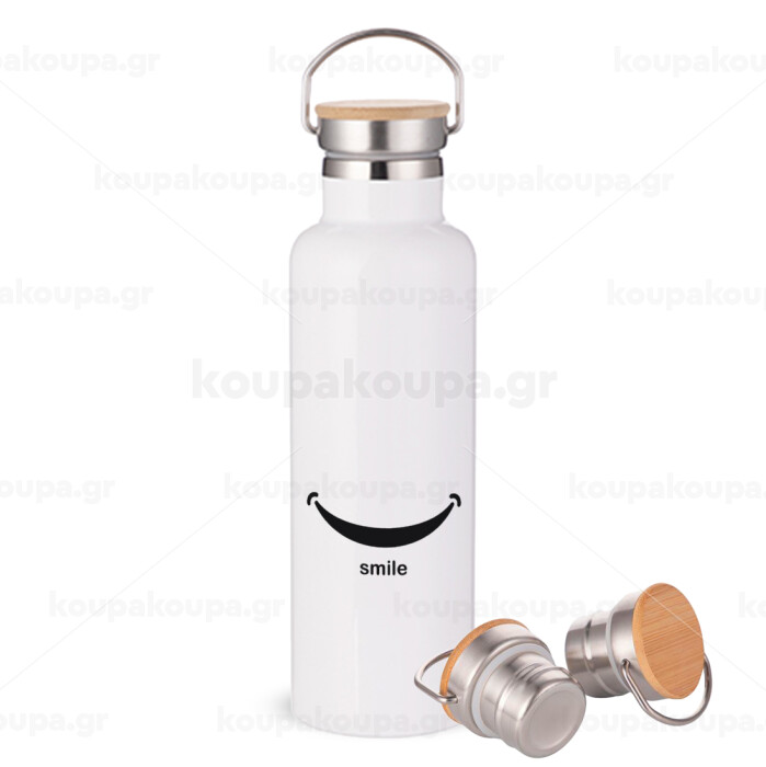 Smile!!!, Μεταλλικό παγούρι θερμός (Stainless steel) Λευκό με ξύλινο καπάκι (bamboo), διπλού τοιχώματος, 750ml