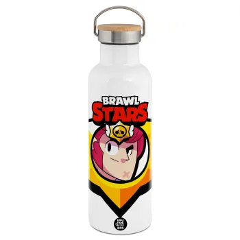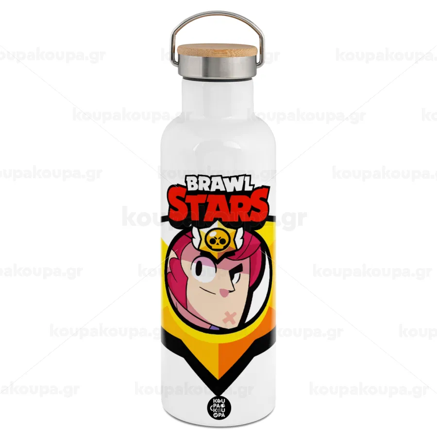 Brawl Stars Colt, Μεταλλικό παγούρι θερμός (Stainless steel) Λευκό με ξύλινο καπάκι (bamboo), διπλού τοιχώματος, 750ml