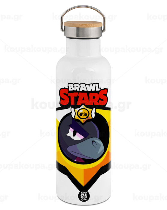 Brawl Stars Crow, Μεταλλικό παγούρι θερμός (Stainless steel) Λευκό με ξύλινο καπάκι (bamboo), διπλού τοιχώματος, 750ml