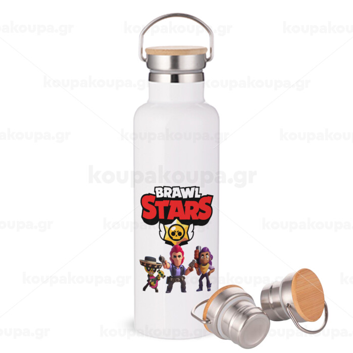 Brawl Stars Desert, Μεταλλικό παγούρι θερμός (Stainless steel) Λευκό με ξύλινο καπάκι (bamboo), διπλού τοιχώματος, 750ml