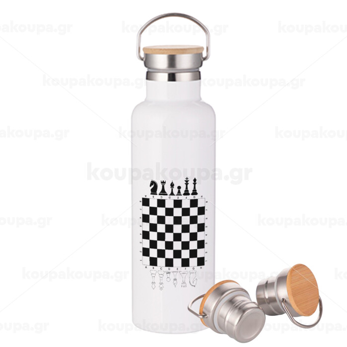Σκάκι, Μεταλλικό παγούρι θερμός (Stainless steel) Λευκό με ξύλινο καπάκι (bamboo), διπλού τοιχώματος, 750ml