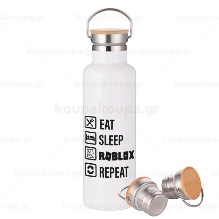 Eat, Sleep, Roblox, Repeat, Μεταλλικό παγούρι θερμός (Stainless steel) Λευκό με ξύλινο καπάκι (bamboo), διπλού τοιχώματος, 750ml