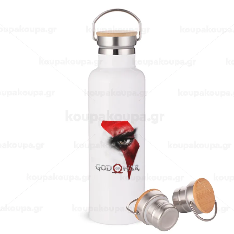 God of war Stratos, Μεταλλικό παγούρι θερμός (Stainless steel) Λευκό με ξύλινο καπάκι (bamboo), διπλού τοιχώματος, 750ml