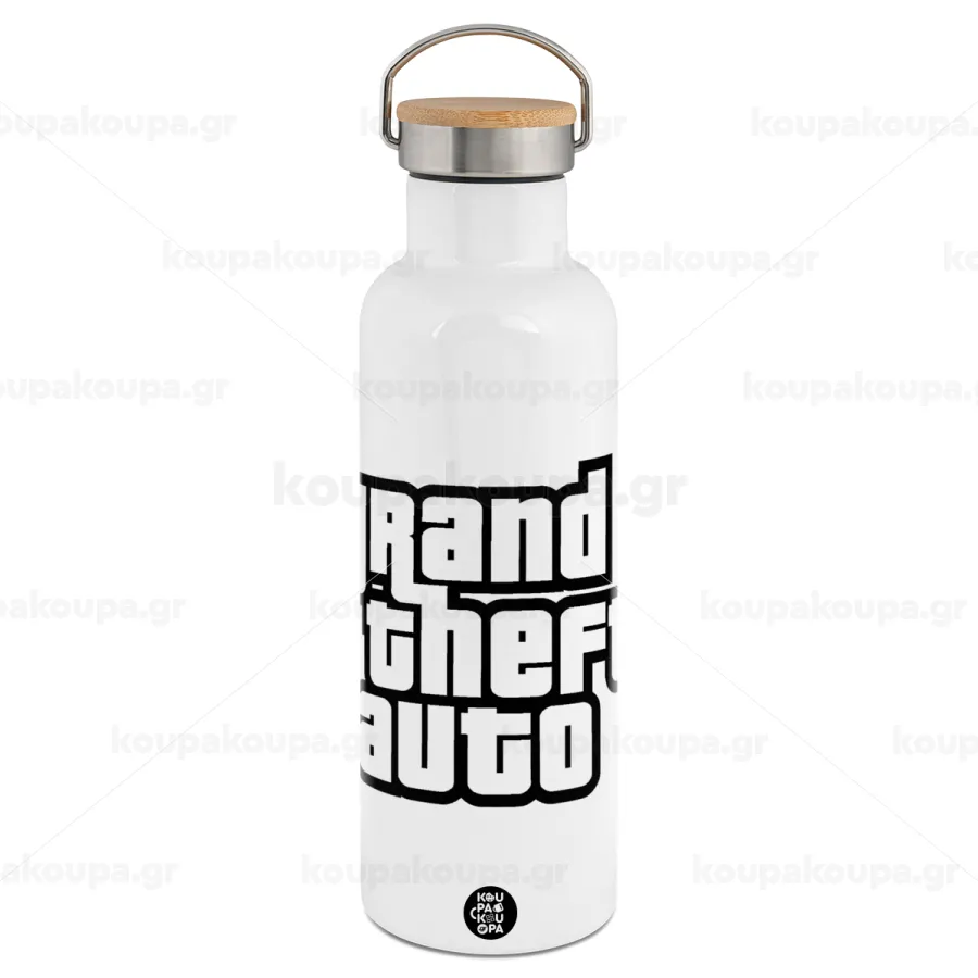 GTA (grand theft auto), Μεταλλικό παγούρι θερμός (Stainless steel) Λευκό με ξύλινο καπάκι (bamboo), διπλού τοιχώματος, 750ml