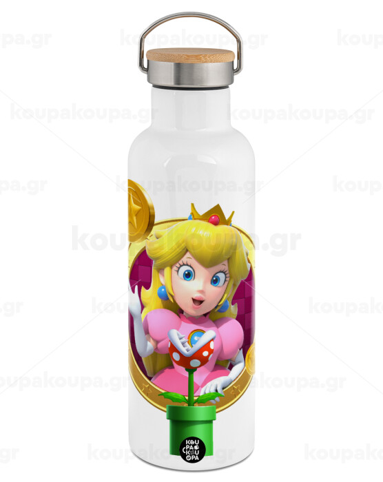 Princess Peach Toadstool, Μεταλλικό παγούρι θερμός (Stainless steel) Λευκό με ξύλινο καπάκι (bamboo), διπλού τοιχώματος, 750ml