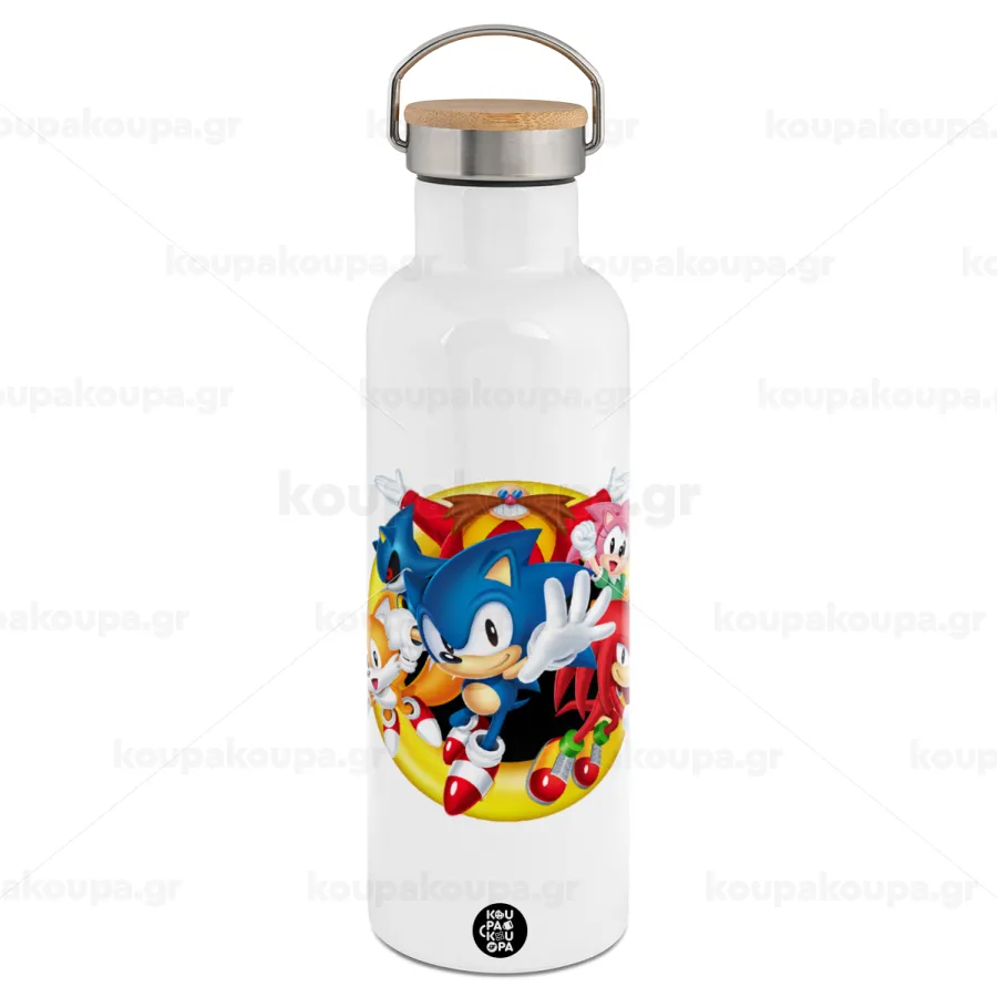 Sonic and friends, Μεταλλικό παγούρι θερμός (Stainless steel) Λευκό με ξύλινο καπάκι (bamboo), διπλού τοιχώματος, 750ml