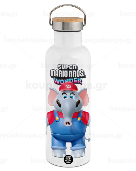 Super mario wonder, Μεταλλικό παγούρι θερμός (Stainless steel) Λευκό με ξύλινο καπάκι (bamboo), διπλού τοιχώματος, 750ml