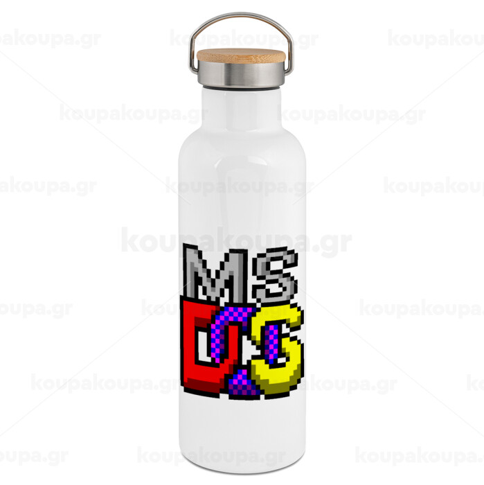 MsDos, Μεταλλικό παγούρι θερμός (Stainless steel) Λευκό με ξύλινο καπάκι (bamboo), διπλού τοιχώματος, 750ml