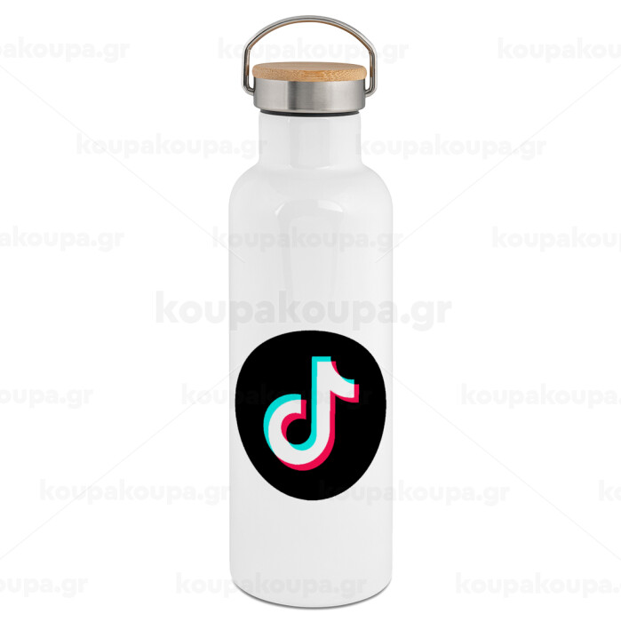 TikTok, Μεταλλικό παγούρι θερμός (Stainless steel) Λευκό με ξύλινο καπάκι (bamboo), διπλού τοιχώματος, 750ml