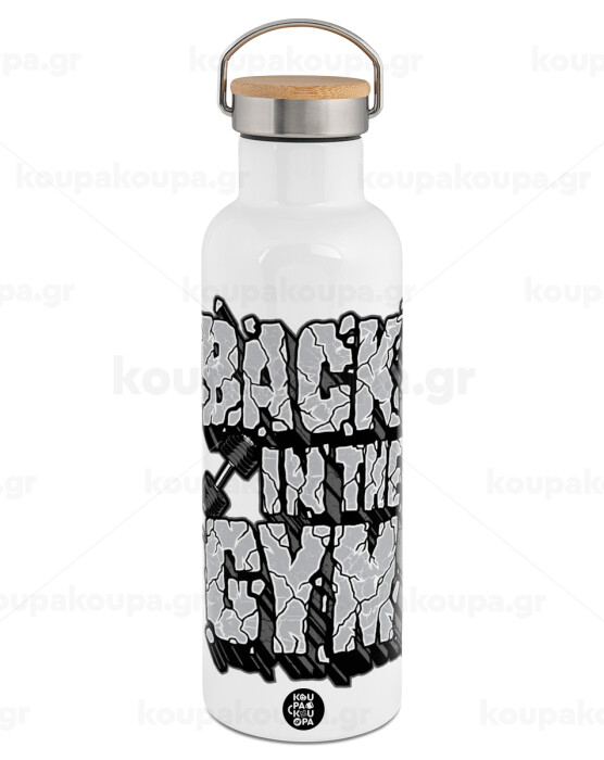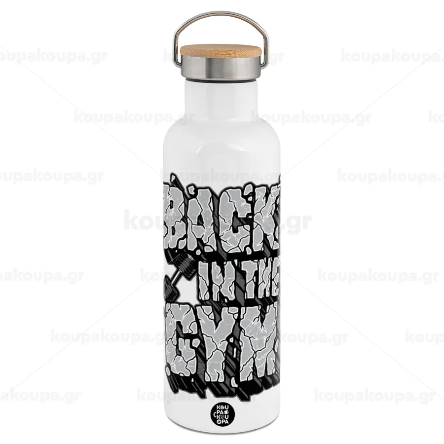 Back in the GYM, Μεταλλικό παγούρι θερμός (Stainless steel) Λευκό με ξύλινο καπάκι (bamboo), διπλού τοιχώματος, 750ml