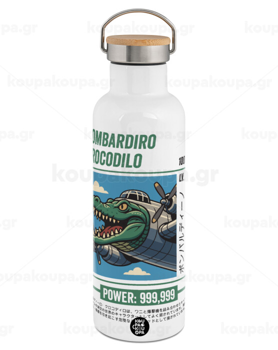 Bombardiro Crocodilo, Μεταλλικό παγούρι θερμός (Stainless steel) Λευκό με ξύλινο καπάκι (bamboo), διπλού τοιχώματος, 750ml