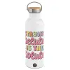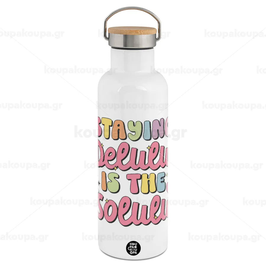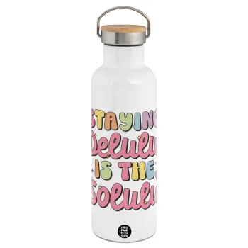 Delulu, Μεταλλικό παγούρι θερμός (Stainless steel) Λευκό με ξύλινο καπάκι (bamboo), διπλού τοιχώματος, 750ml
