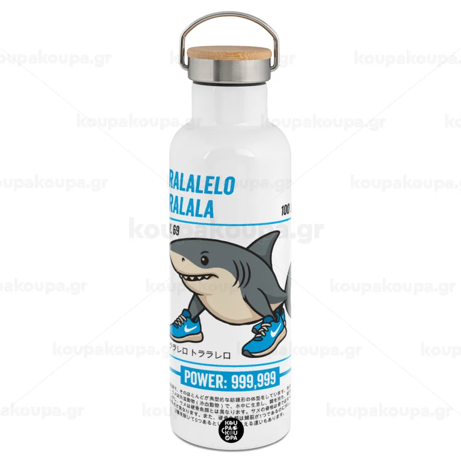 Tralalero Tralala, Μεταλλικό παγούρι θερμός (Stainless steel) Λευκό με ξύλινο καπάκι (bamboo), διπλού τοιχώματος, 750ml