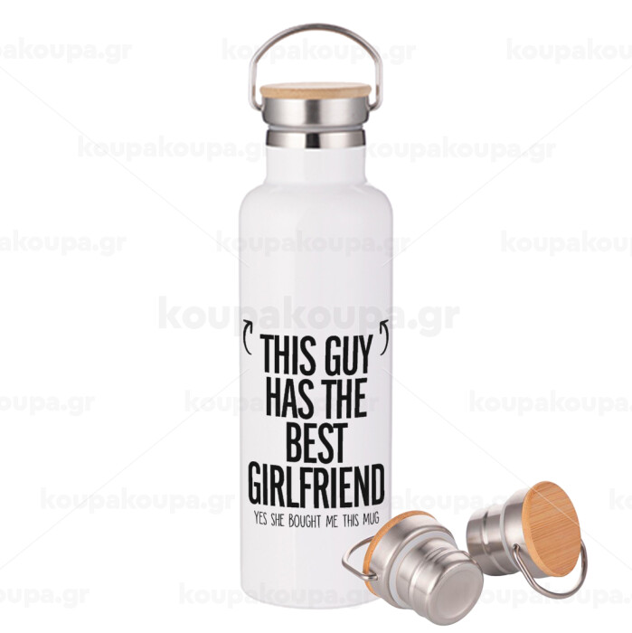 This guy has the best Girlfriend, Μεταλλικό παγούρι θερμός (Stainless steel) Λευκό με ξύλινο καπάκι (bamboo), διπλού τοιχώματος, 750ml